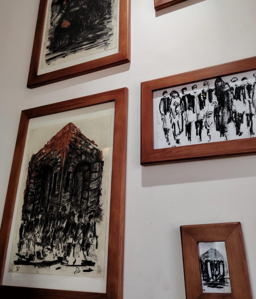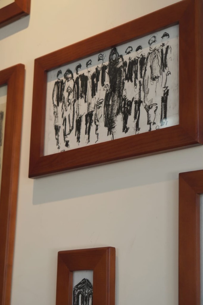 A historic monument standing in permanence, facing contemporary artistic expression documenting the present moment — particularly as most of the works were executed in charcoal, a medium direct and closely tied to reality.